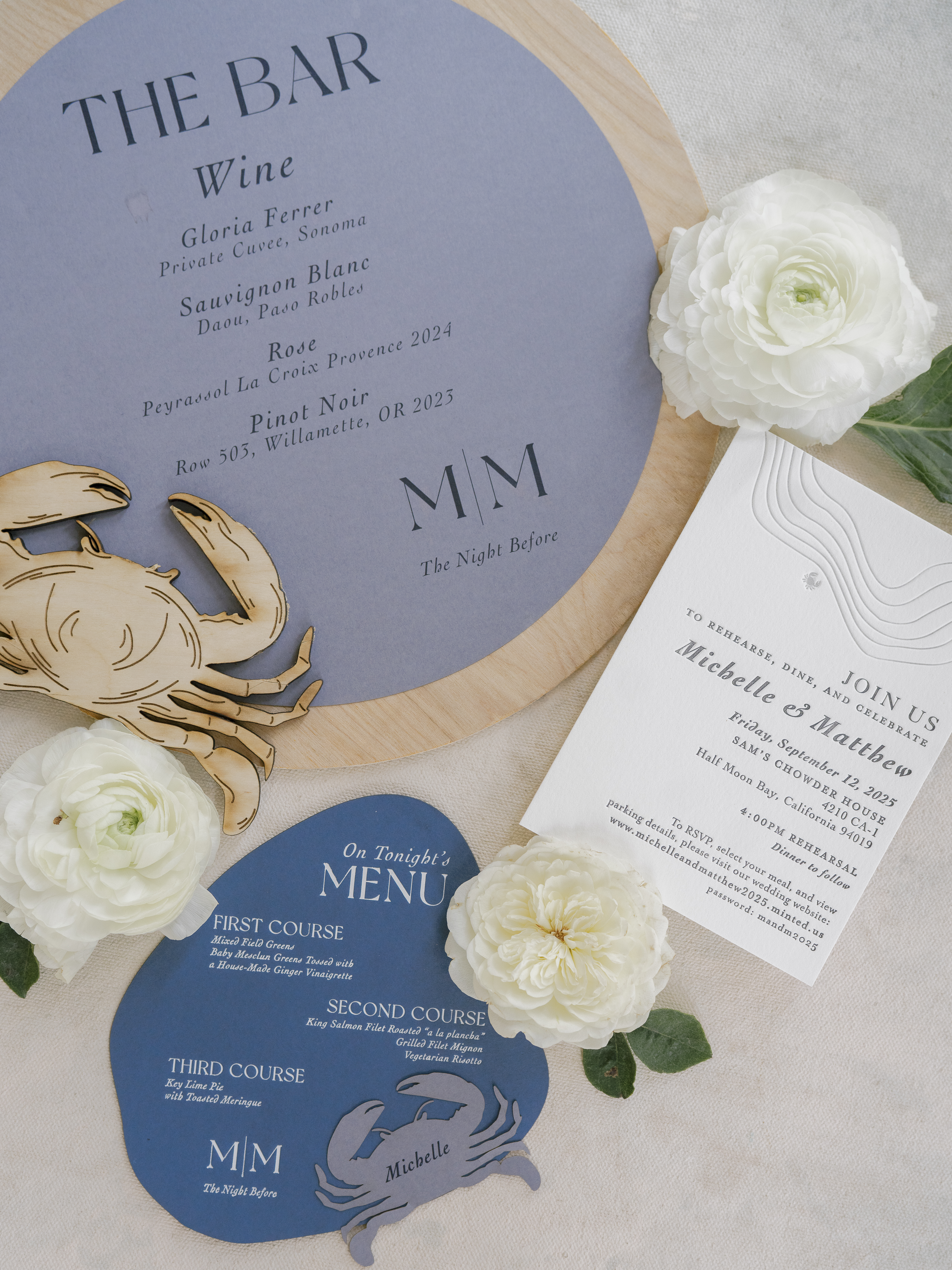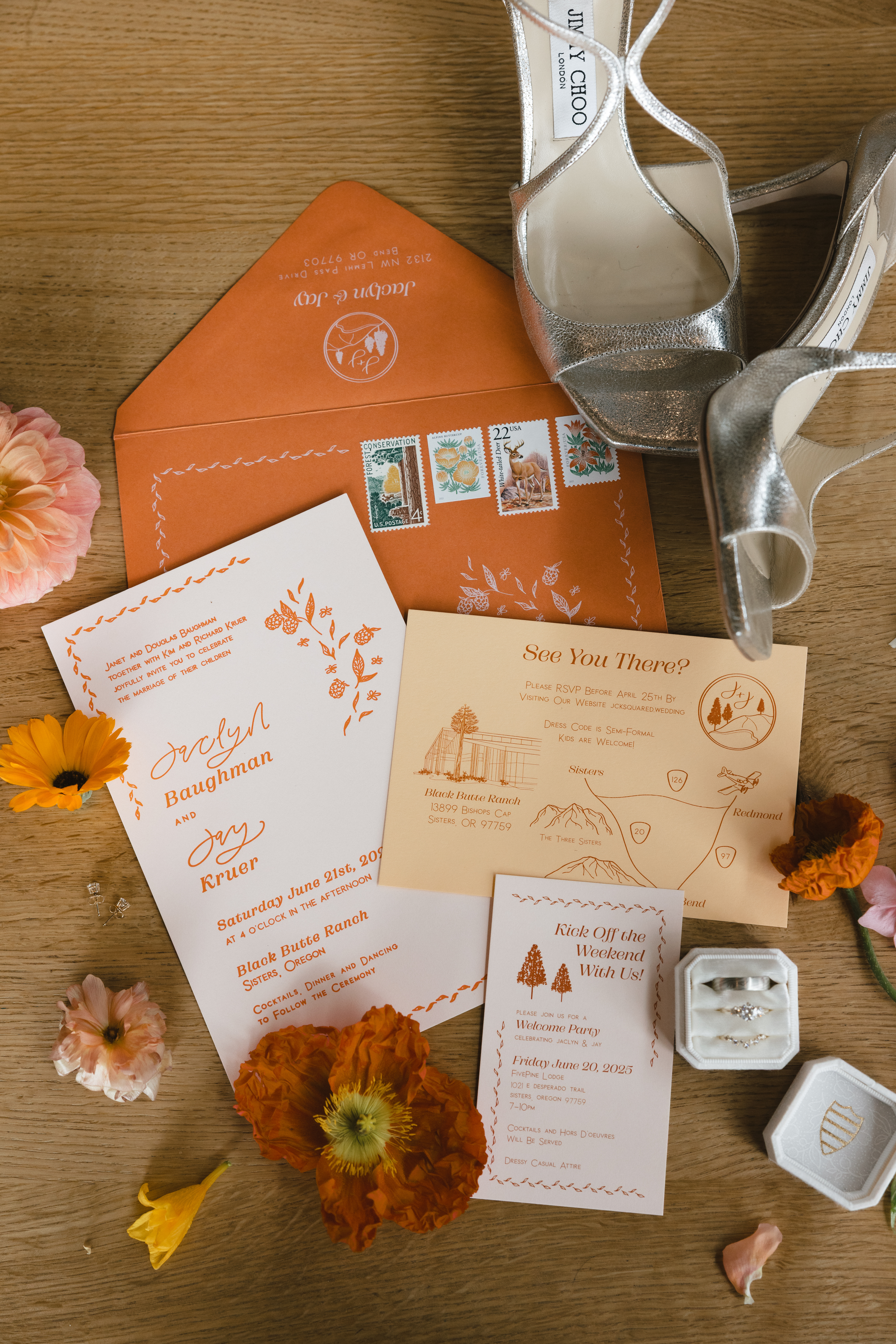 The day started with a custom invitation suite dripping with personalized details. I created them a custom monogram which was later included in their day-of details and set the tone for a modern affair. The main invitation included a custom sketch of the Sunriver Great Hall and the suite also included a custom map that outlines all the popular spots in Sunriver as well as some key travel details to make it easier for their guests to get around.