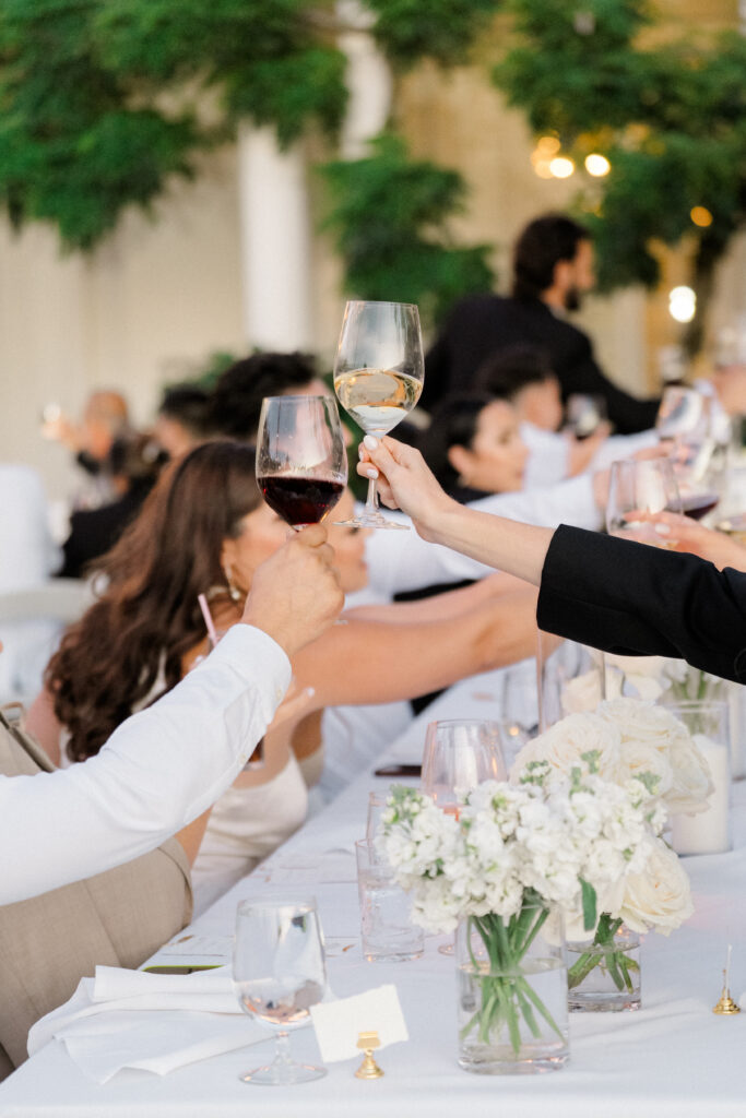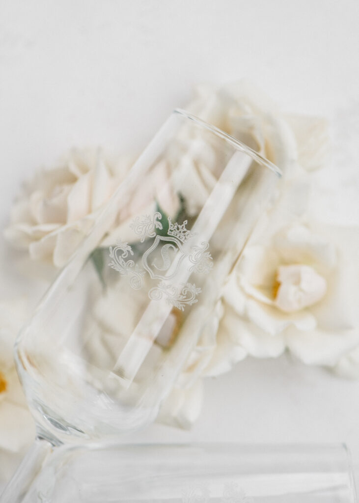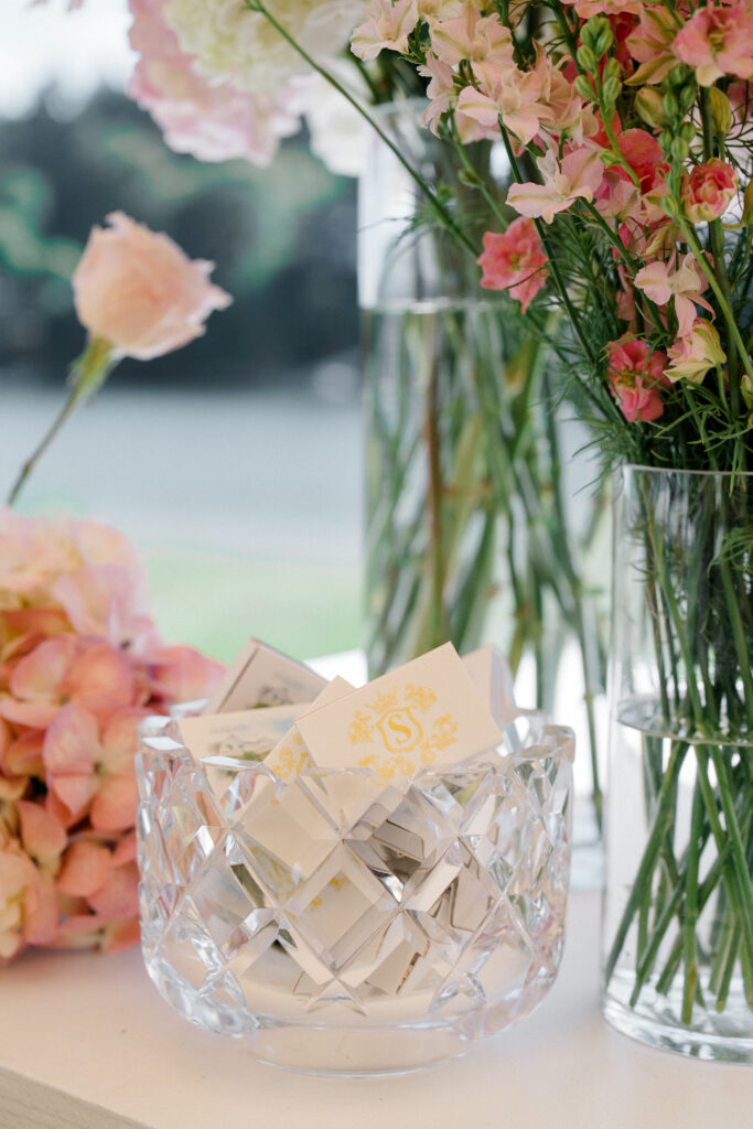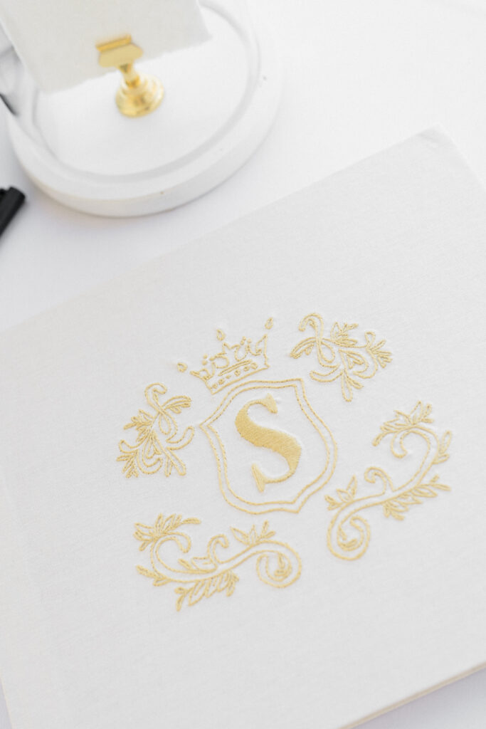 The design began with a bold monogram crest that became the heartbeat of the weekend. Established in their invitation suite featuring pillowy letterpress and hand-torn paper, the crest carried a sense of old-world craftsmanship while still feeling fresh and elevated. That monogram appeared everywhere — etched onto champagne glasses, wrapped around cigars, woven throughout signage and stationery, and layered into reception details. It created a seamless visual identity that tied the entire day together. Each piece felt cohesive and unmistakably theirs!
