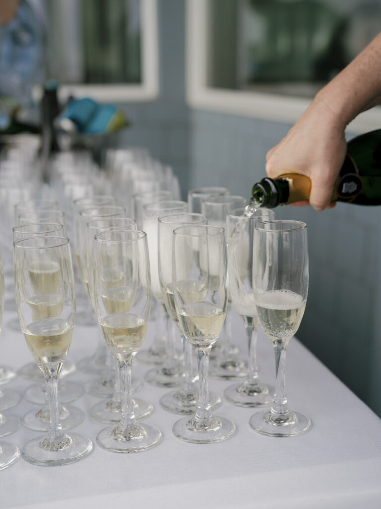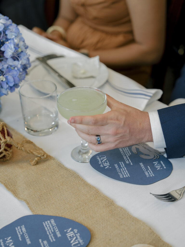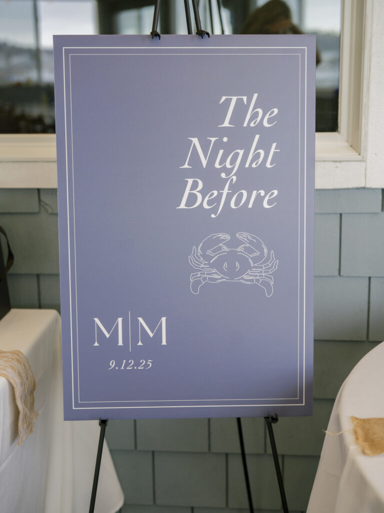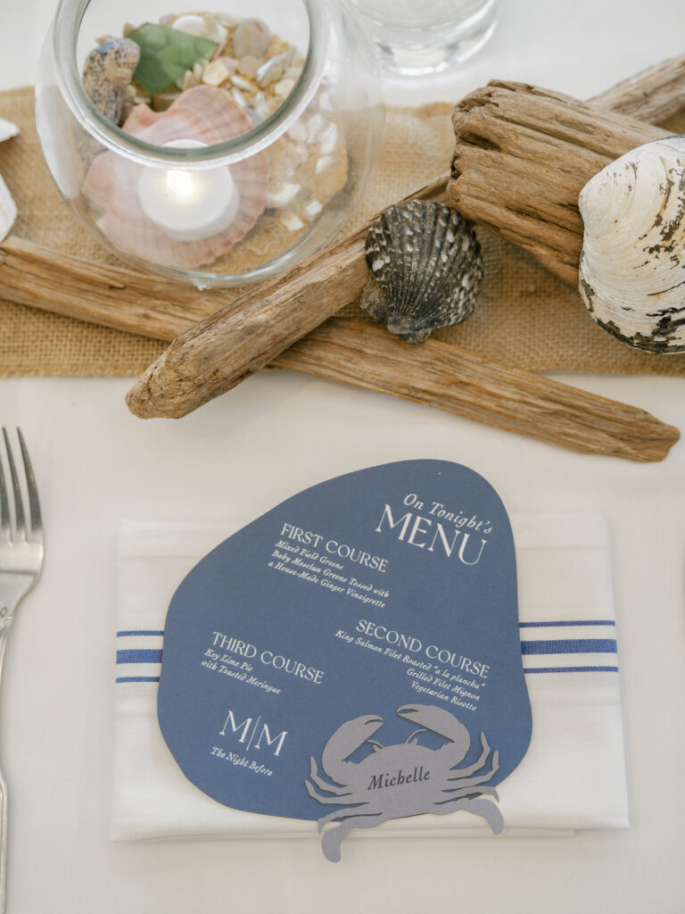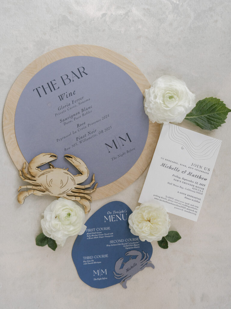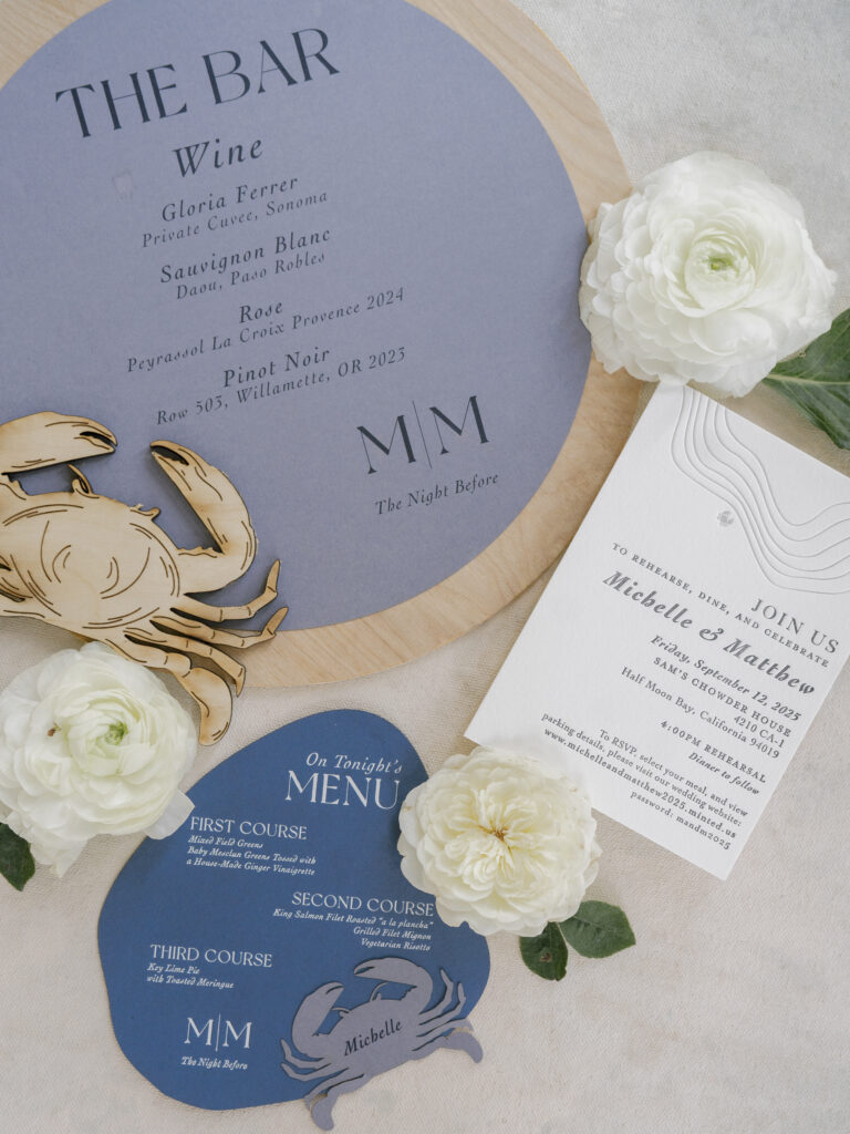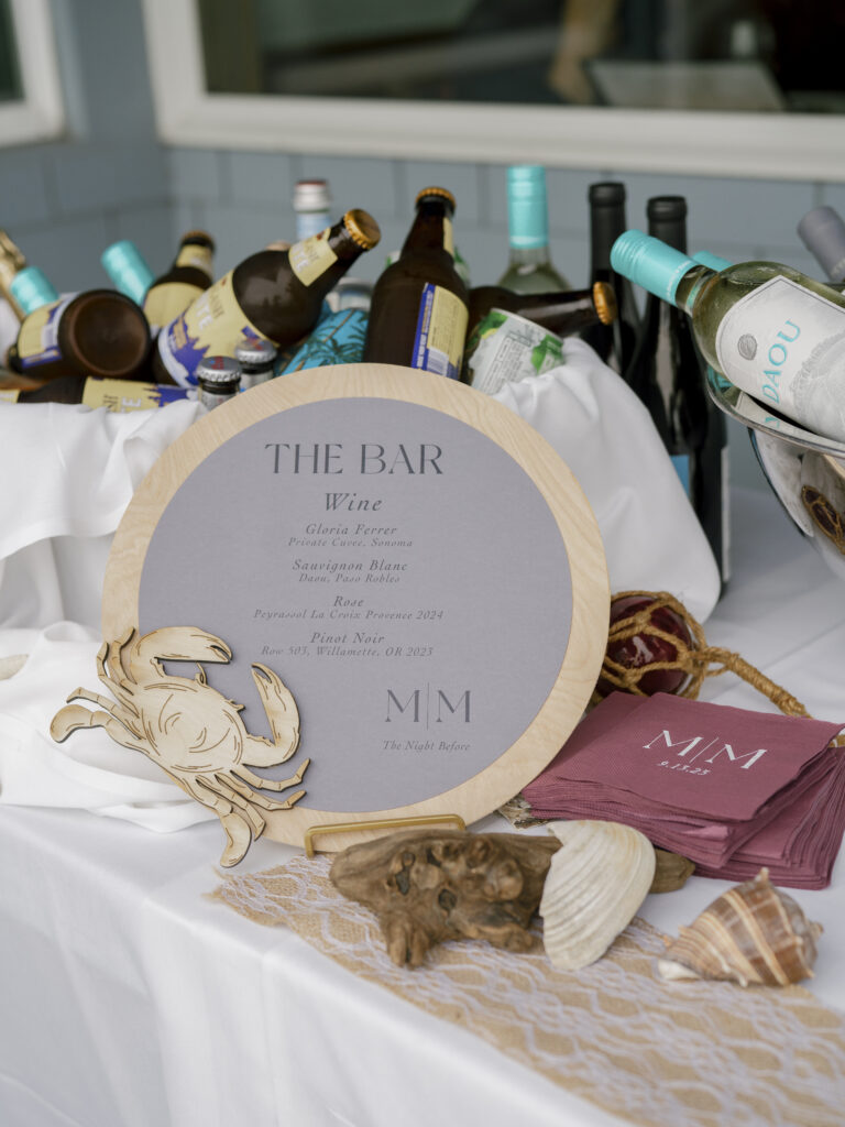 Each place setting featured a small crab-shaped place card, a playful but refined detail that felt right at home in the Bay. That same crab motif carried over to the bar menu, this time translated into wood for added warmth and contrast. This welcome party set the tone for the weekend ahead and was a sweet reflection of both the setting and the couple!