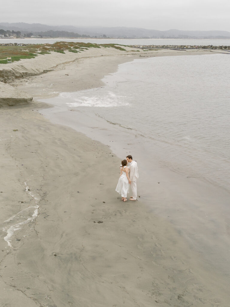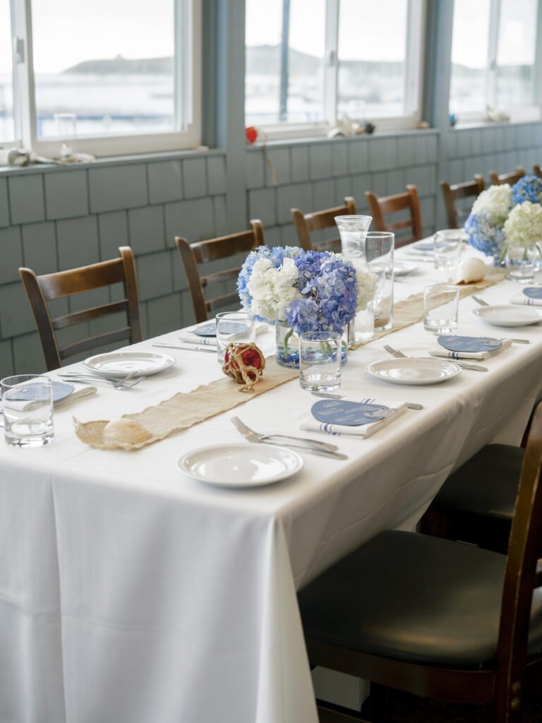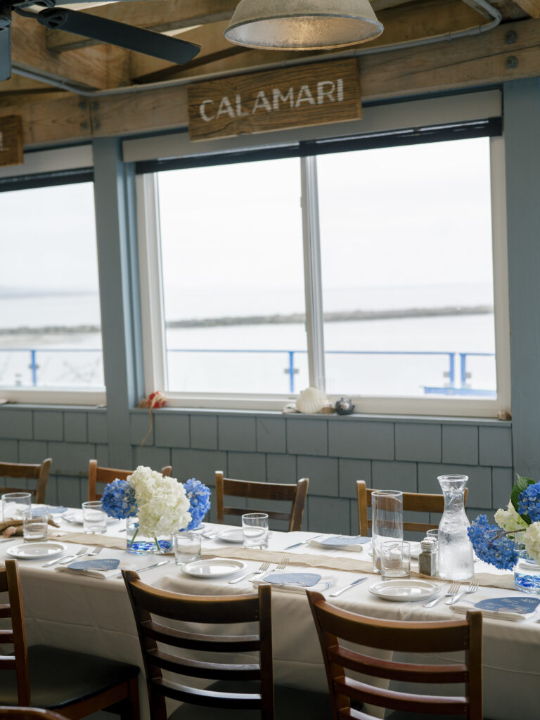 Matt + Michelle kicked off their wedding weekend the California way — with ocean views, blue-on-blue details, and an intimate dinner overlooking the San Francisco Bay. The design leaned into coastal tones without feeling themed. Layered shades of blue set the foundation, allowing texture and shape to do the storytelling. Custom pebble-shaped menus brought a soft, organic element to the table settings, subtly nodding to the shoreline just beyond the restaurant.