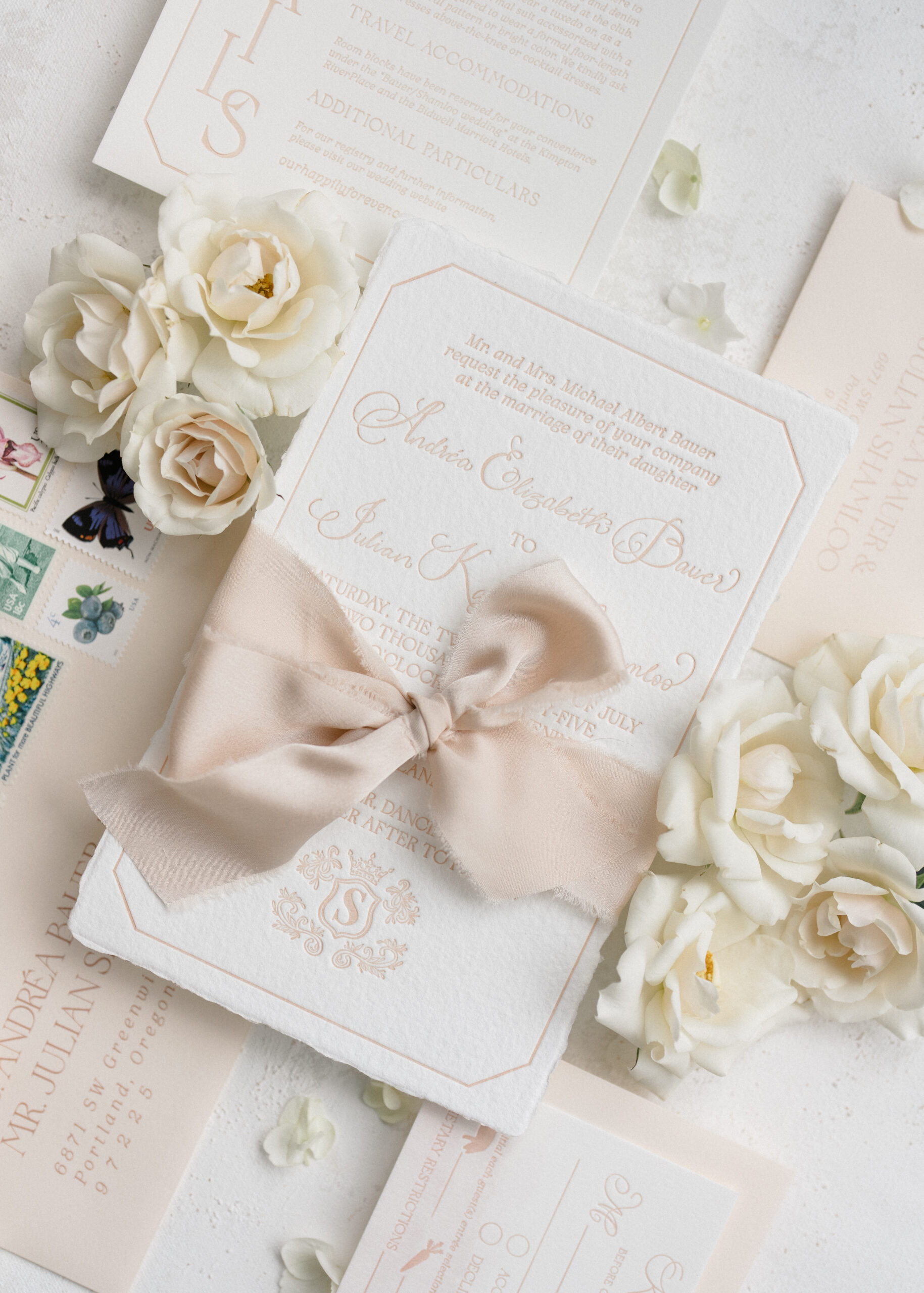 Julie and Jeff’s wedding at Black Butte Ranch was a true reflection of their story as airline pilots. With the mountains as their backdrop, they chose soft champagne and blush details that paired perfectly with the natural setting.